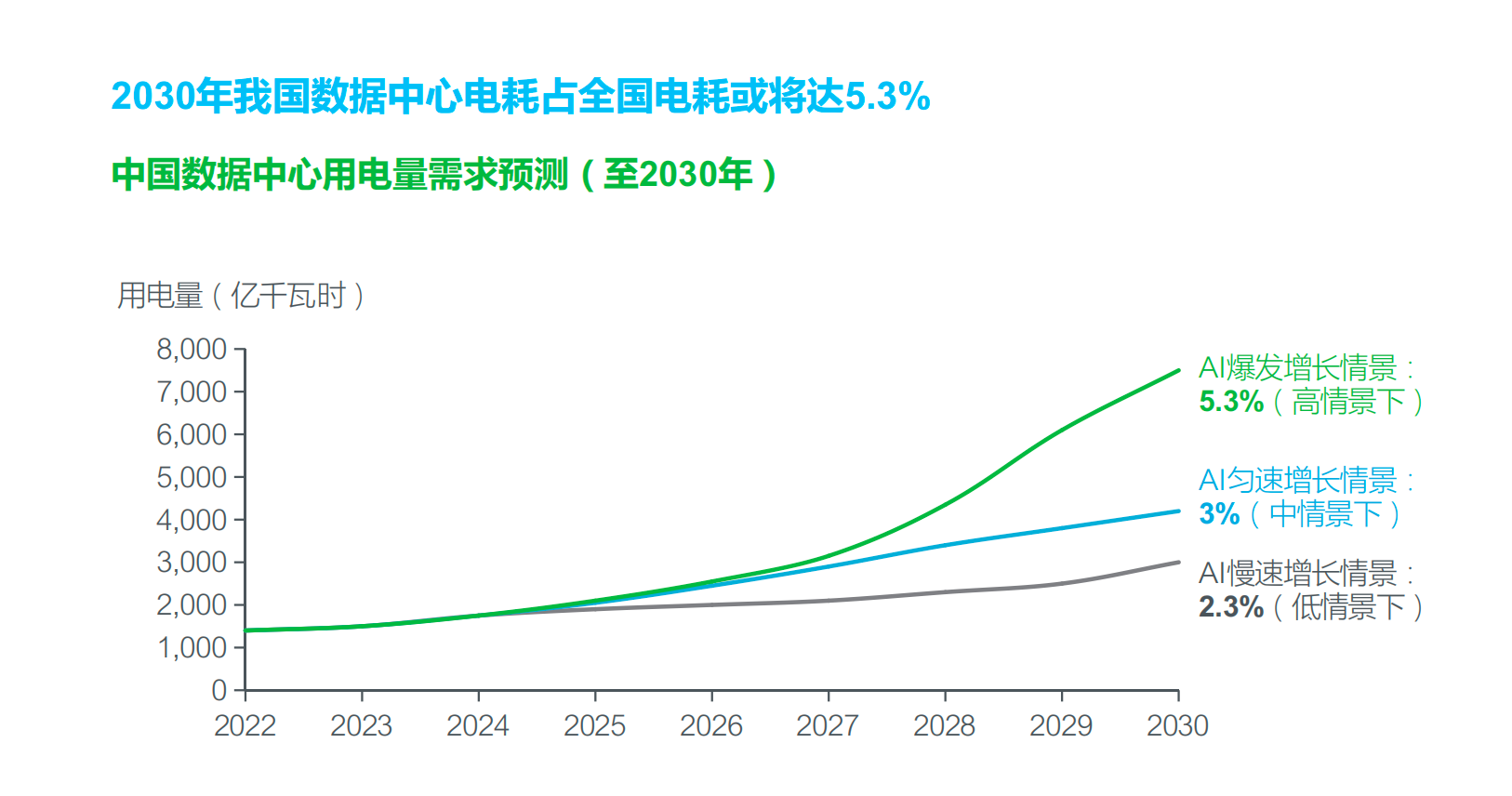作为AI时代的“数字油田”,智算中心的能源消耗正呈几何级数增长。根据《绿色算力发展研究报告(2025年)》,2024年我国数据中心用电量1660亿千瓦时,占全社会用电量约2%。施耐德电气商业价值研究院预测,到2030年,我国数据中心在用电量高情景下或突破7000亿千瓦时,占全国总用电量5.3%。