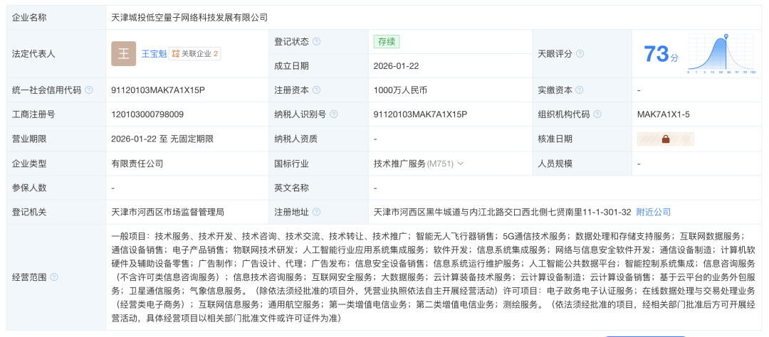 据天眼查工商信息,2026年01月22日,天津城投低空量子网络科技发展有限公司成立。发起方为天津低空经济投资发展有限公司(持股51%)和中国电信全资子公司——中电信无人科技(江苏)有限公司(持股49%)。法定代表人为王宝魁,注册资本为1000万元。