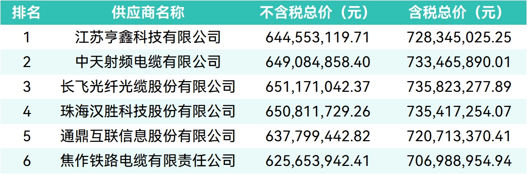 经评审,江苏亨鑫科技有限公司以含税总价7.28亿元位列第一中标候选人;中天射频电缆有限公司综合排名第二;长飞光纤光缆股份有限公司综合排名第三;珠海汉胜科技股份有限公司综合排名第四;通鼎互联信息股份有限公司综合排名第五;焦作铁路电缆有限责任公司综合排名第六。