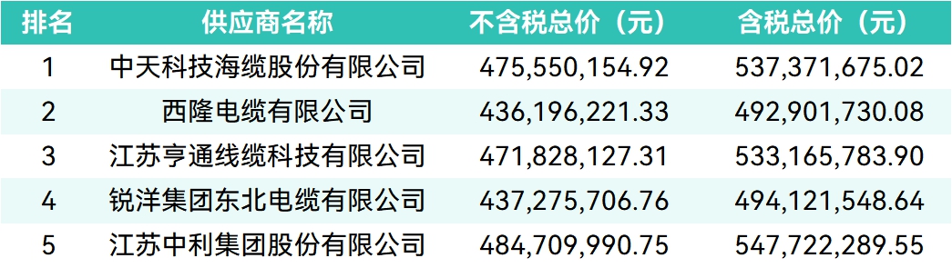 经评审,中天科技海缆股份有限公司以5.37亿元含税报价位居第一中标候选人,西隆电缆有限公司综合排名第二,江苏亨通线缆科技有限公司综合排名第三,锐洋集团东北电缆有限公司综合排名第四,江苏中利集团股份有限公司综合排名第五。